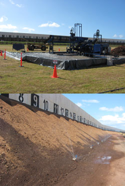 Project Description: The Puuloa Rifle range berms are some of the tallest and largest rifle berms in the Pacific region and stand 22 feet high and 650 feet in length. HIES scope entailed design, de-leading, hazardous material testing (EA), and erosion/slope control implementation of Range A andB located in the Puuloa Training facility at Ewa Beach, HI. HIES designed and subsequently implemented an erosion control plan using civil, structural, GIS, and Geophysical engineers for berms A and B to control soil, slope, and water erosion on the berms. The erosion design was implemented due to the possibility that a 15’ tall 550’ long concrete bullet deflecting wall located on top of the earthern 22’ tall berm had the possibility of collapse due the undermining of the berm caused by natural erosion and bullet impact. The erosion control berm design used geogrids for benching and slope retention thus using no metals or materials that would cause bullet deflection. This was a unique solution and may be the first of its kind.